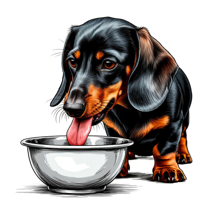 Такса ест из миски на белом фоне скачать или распечатать