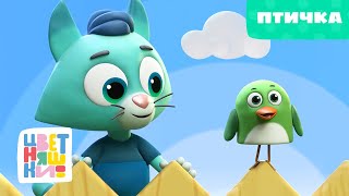 В девятнадцатой серии мультфильма капельки Цветняшки открывают свой альбом на зелёной странице. Сегодня здесь громко чирикают птички. Только у одной из них не получается произнести ни звука. «Эй, Котёнок, помоги, птичку петь ты научи!»