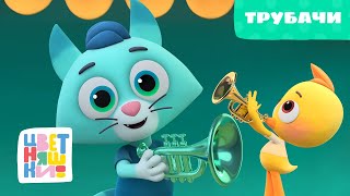 Ту-ту-ту, труба зовёт! Скорей включайте музыкальную серию, где Котёнок Мур и его друзья дают замечательный концерт. Они сегодня трубачи — каждый играет на своей трубе и получается красивая, звонкая песня. Капельки Цветняшки в восторге!