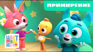 Учим малышей распознавать у себя и у других такие негативные эмоции как злость и грусть. Знакомим детей с разными ритуалами примирения, которые помогают завершить ссору. Благодаря Цветняшкам ребята узнают, что дружба — это не только игры и веселье. Иногда между друзьями случаются ссоры и недоразумения. Хорошо, что есть специальная песенка, которая поможет быстро помириться!