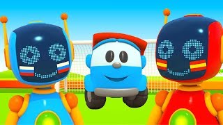 Грузовичок Лева собирает газонокосилку для футбольного поля. Красный и синий роботы играют в футбол, но их мяч улетел в высокую траву, чтобы его достать, нам нужно собрать газонокосилку!