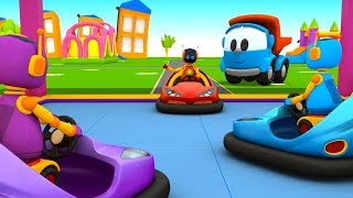 На детской площадке новый аттракцион – автодром! Это - бамперные машинки! Роботы будут на них кататься! Смотри, как весело! Но машинки всего две! Красному роботу машинки не хватило! Машинка Лева тебе поможет! Давай посмотрим, какую машинку можно собрать! Лева, выгружай детали!